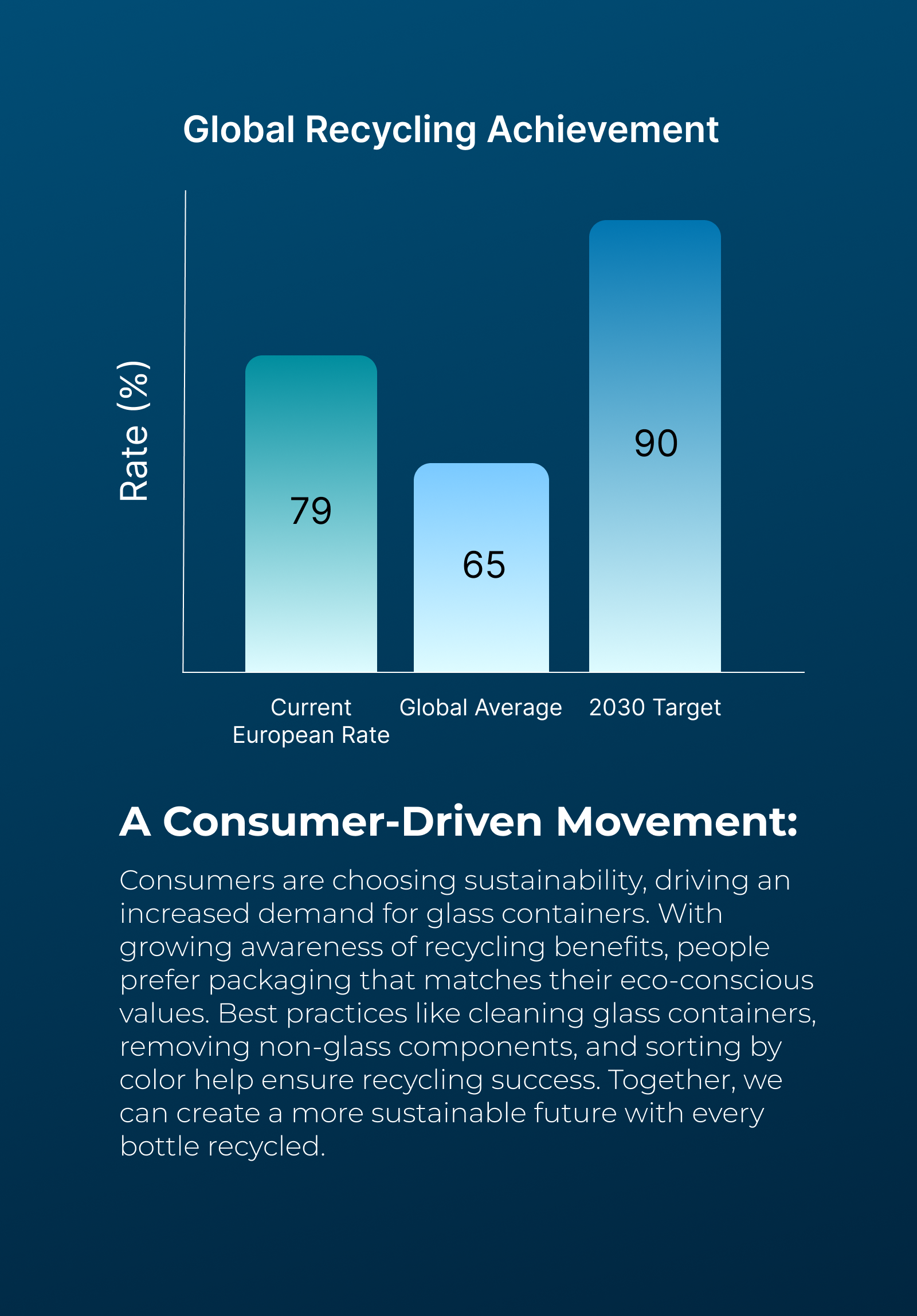Its unique qualities make it a powerhouse of eco-friendliness. With European recycling rates at an impressive 79% and ambitious goals to reach a 90% collection rate by 2030, glass is setting the benchmark for responsible packaging. Its endless recyclability positions it as a leader in the circular economy.